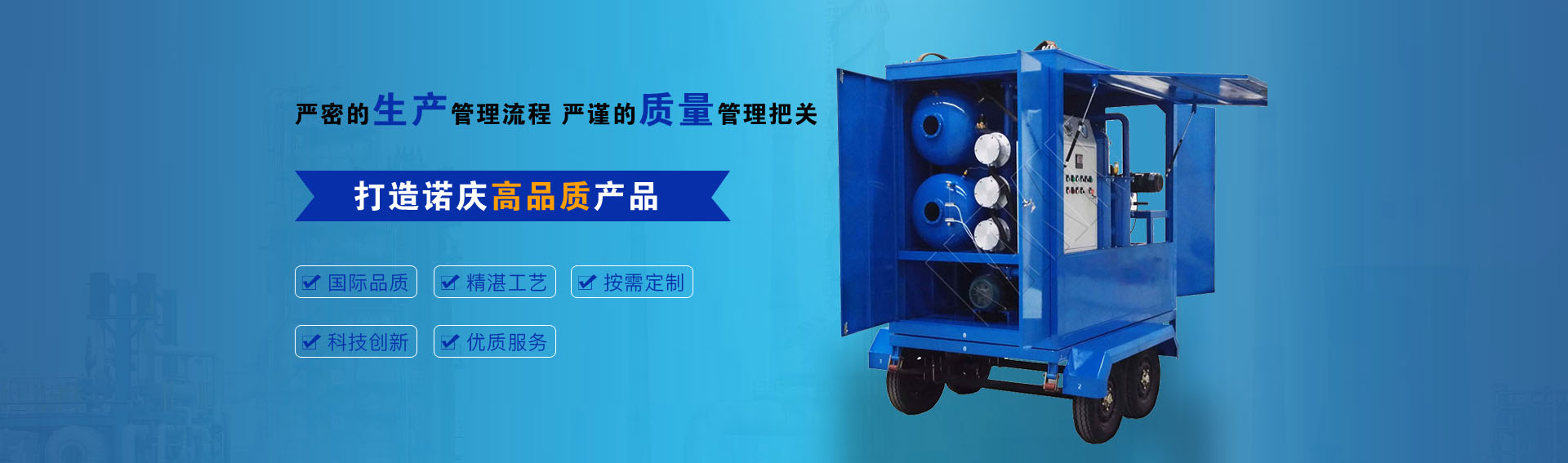 公司通過ISO9001-2015質(zhì)量管理體系認(rèn)證,CE歐盟認(rèn)證,諾慶公司所有濾油機(jī)配套產(chǎn)品均采用國內(nèi)外知名品牌,經(jīng)過多年的使用,具有質(zhì)量可靠,性能優(yōu)良。公司擁有完備的檢測儀器和檢測設(shè)備,所有產(chǎn)品出廠前經(jīng)過嚴(yán)格測試,保證每一臺(tái)產(chǎn)品合格出廠。生產(chǎn)實(shí)力雄厚